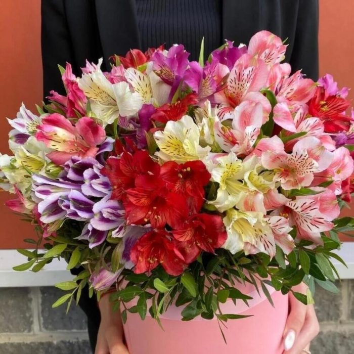 Альстромерия – 25 шт.Шляпная коробка – 1 шт.Оазис флористический – 1 шт.