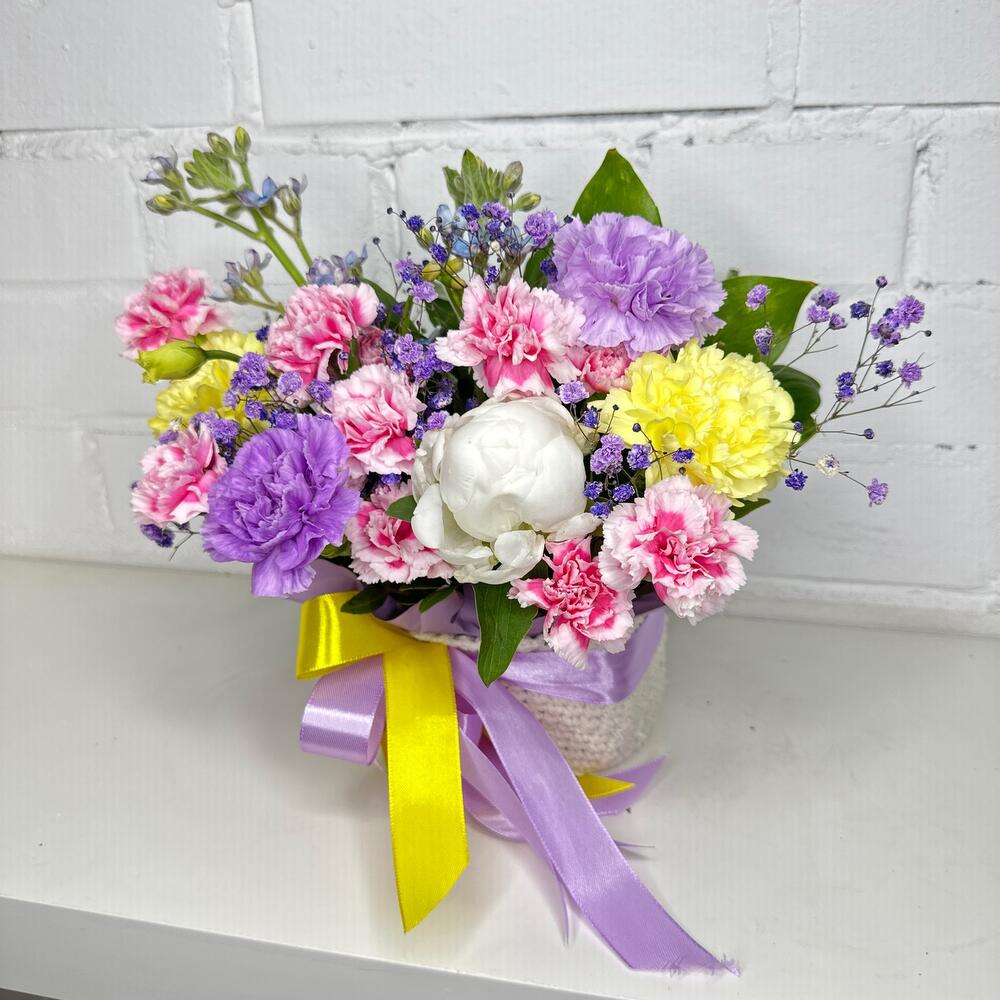 Диантус кустовой – 7 шт.Диантус – 4 шт.Оксипеталум – 2 шт.Гипсофила – 3 шт.Фисташка – 3 шт.Оазис флористический – 1 шт.Плетеное кашпо – 1 шт.