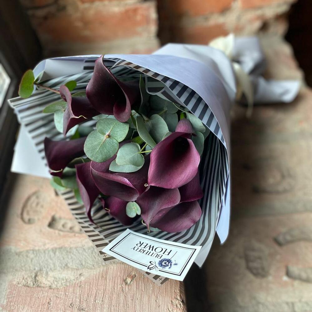 Букет из 9 черных калл с эвкалиптом в упаковке “Агостина”