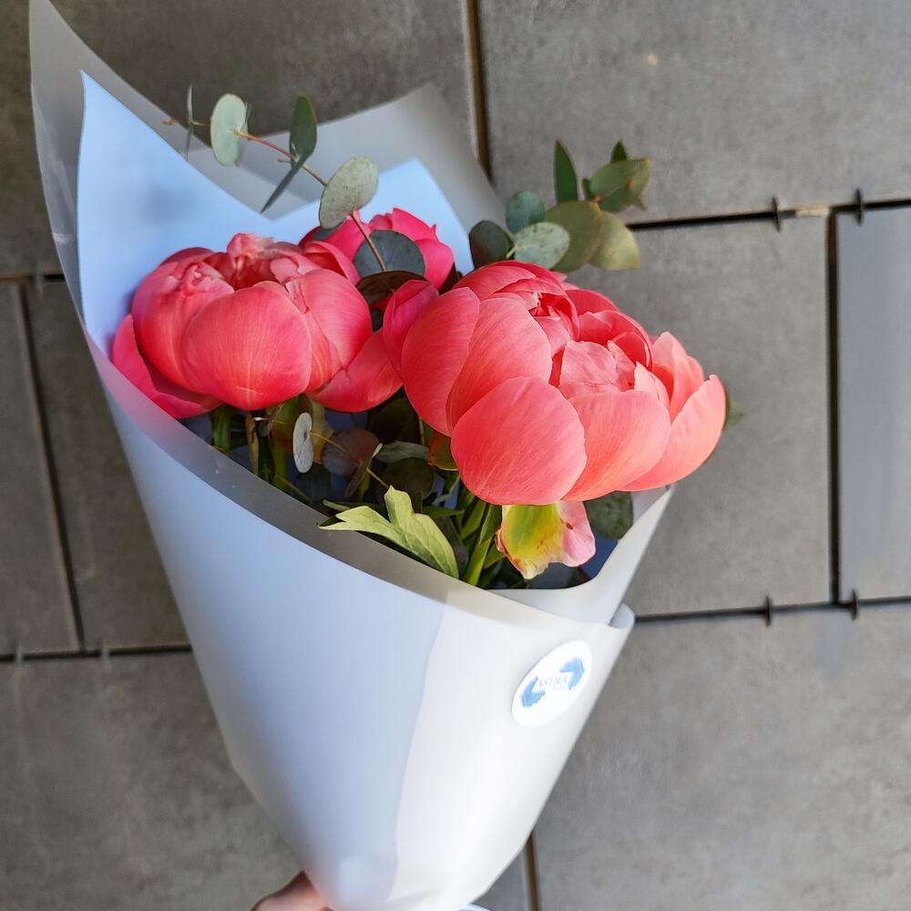 Эвкалипт – 3 шт.Атласная лента – 1 шт.Пион coral sunset – 5 шт.Авторская упаковка – 1 шт.