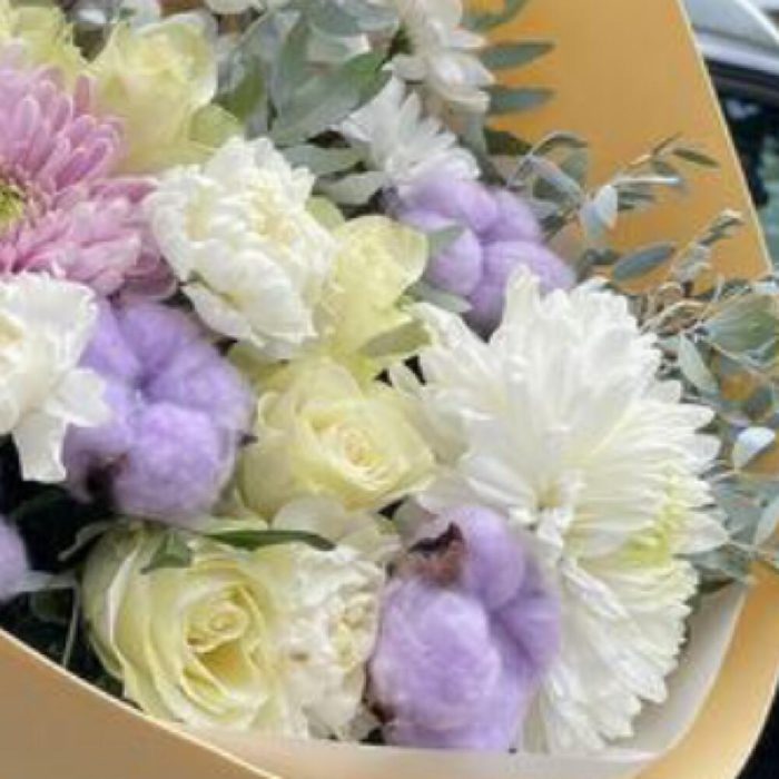 Хризантема кустовая – 1 шт.Хризантема – 1 шт.Гвоздика – 4 шт.Лента атласная – 2 шт.Пленка матовая – 6 шт.Хлопок натуральный – 5 шт.Роза россия белая – 7 шт.фисташка зелень – 5 шт.россана – 1 шт.