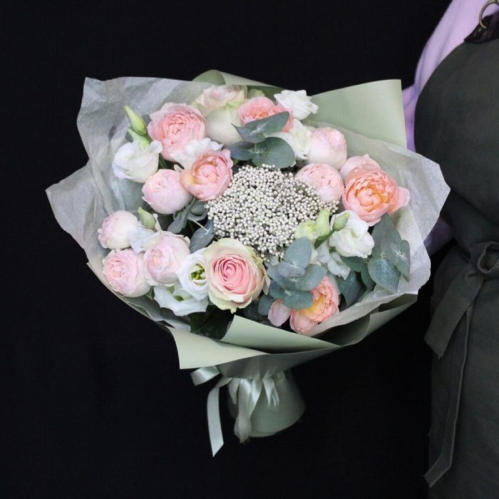роза эквадор фруттето – 2 шт.Роза кустовая пионовидная джульетта – 1 шт.роза кустовая пионовидная мансфилд парк – 2 шт.Озотамнус – 1 шт.Эвкалипт – 1 шт.Эустома – 2 шт.Тишью – 1 шт.Пленка дизайнерская – 2 шт.