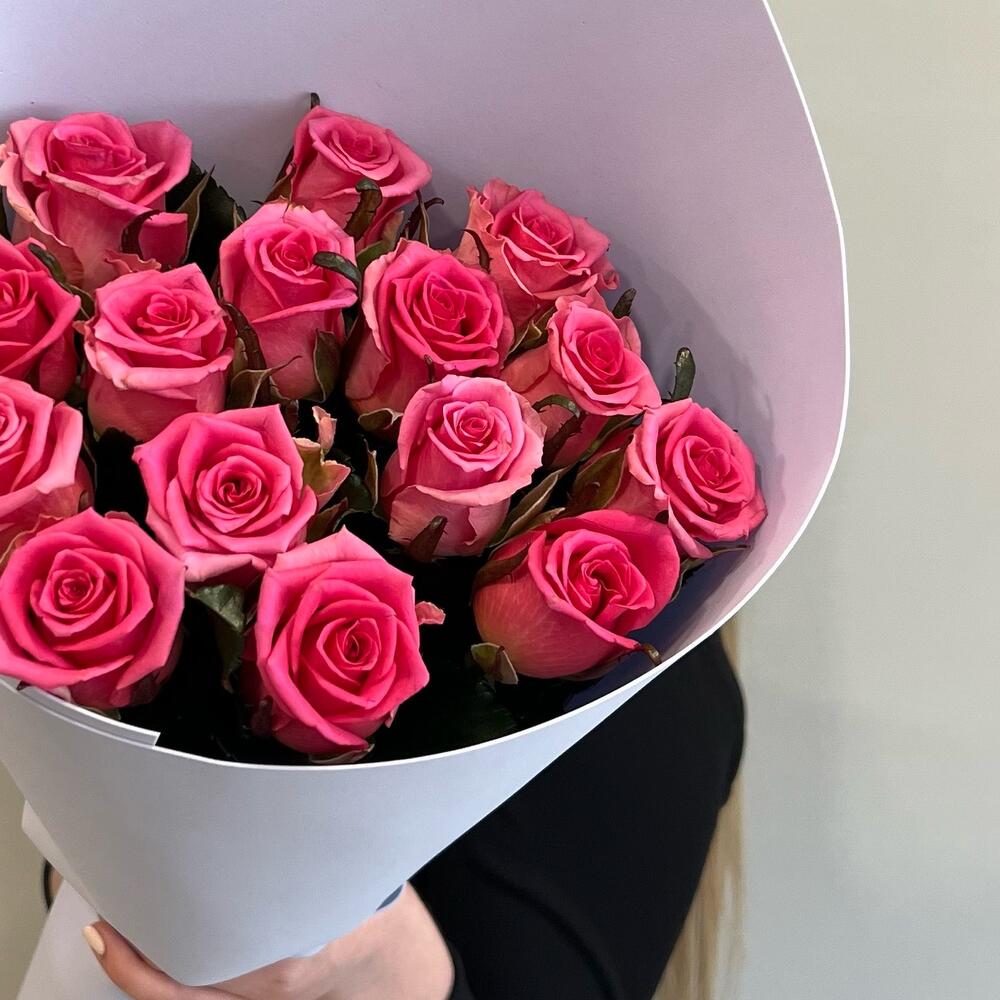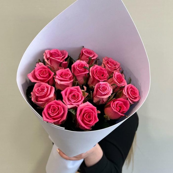 Букет из 15 розовых роз в упаковке