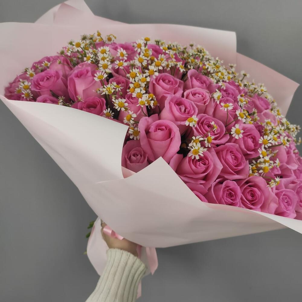 Букет из 91 розовой розы и 22 ромашек