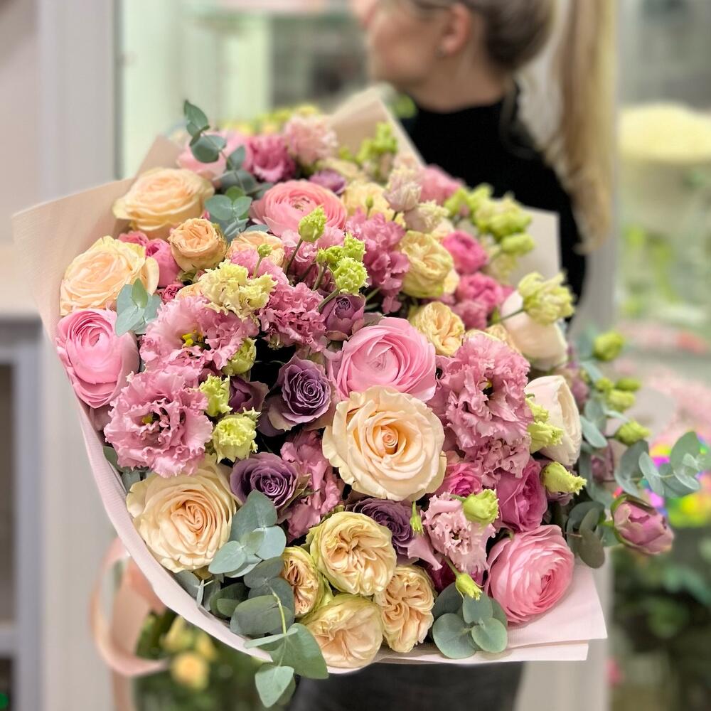 Ранункулюс клуни – 7 шт.кустовая садовая роза – 9 шт.садовая одноголовая роза – 7 шт.Лизиантус алиса – 7 шт.Эвкалипт – 1 шт.Дизайнерская упаковка – 1 шт.Открытка – 1 шт.
