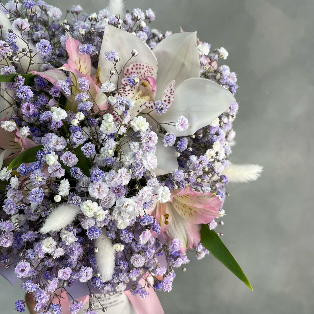 Коробка шляпная – 1 шт.Пена флористическая – 1 шт.Орхидея Цимбидиум – 3 шт.Альстромерия – 3 шт.Гипсофила – 5 шт.Лагурус – 9 шт.